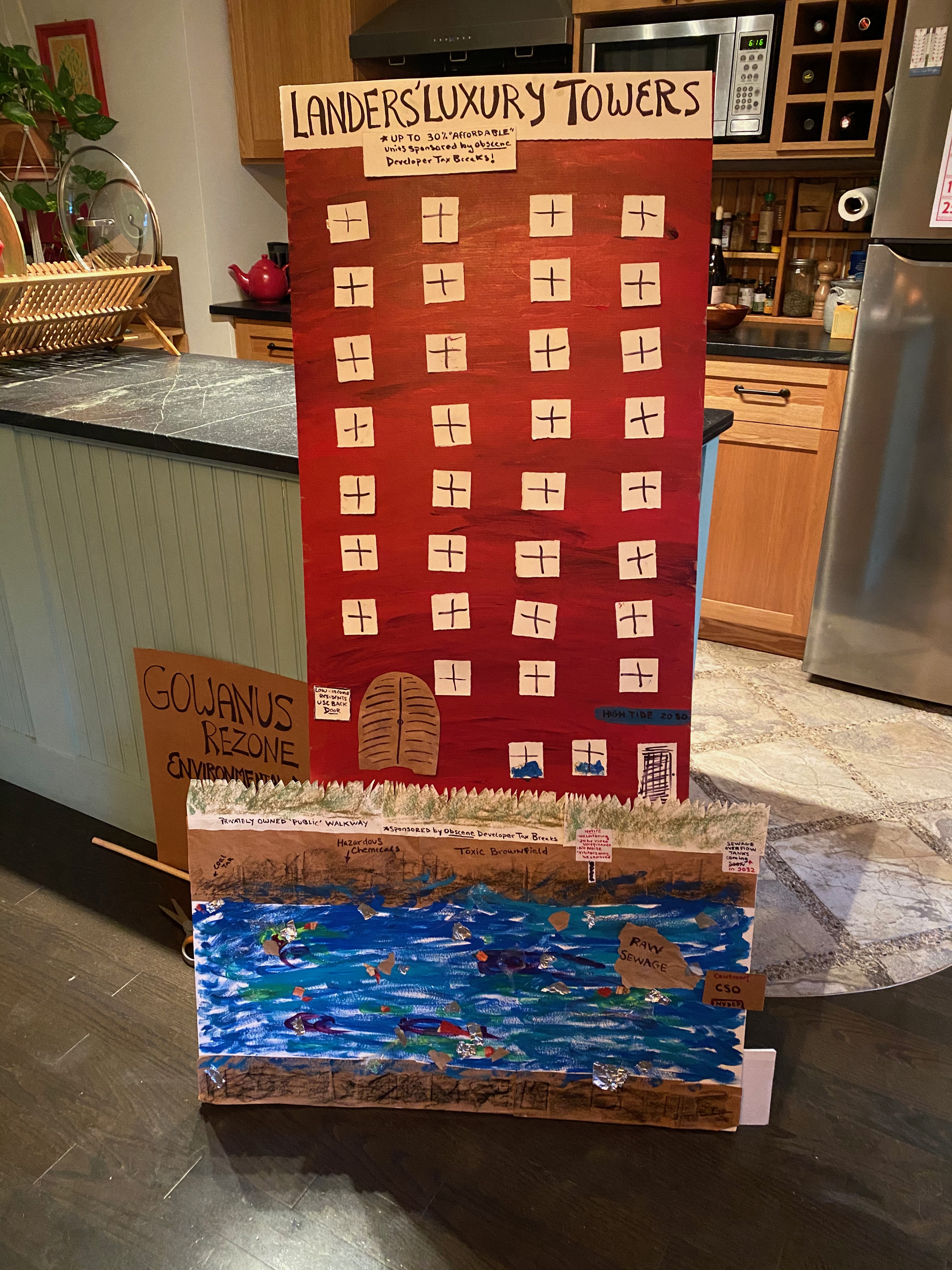 Garbage Art Garbage art created for direct action and eco-social events Gowanus Virtual ULURP Protest Public Place Banner Making ULURP Clock for Land Use Action Luxury Tower on Gowanus Canal Wearable Airplane for Climate Action Empathy Against Austerity Booth